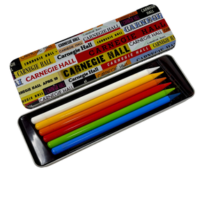 These six colored woodless graphite pencils and arrive in a custom-printed tin box, featuring a vibrant design that incorporates type treatments from concert posters throughout Carnegie Hall's history.