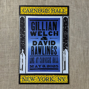 Designed & printed by the historic Hatch Show Print in Nashville, TN, this show poster for Gillian Welch & David Rawlings at Carnegie Hall in New York City in May 2025 measures 13 3/4" x 21 3/4".